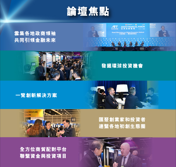 與超過3,600 環球財金官員和商界領袖一同參加亞洲金融論壇,於2026 年始之共同探索環球市場展望及產業投資機遇。AFF2026將成為AFF+,內容將突顯產業合作元素,加強探討高增長產業對環球經濟的影響,並涵蓋如中東及東南亞等新興市場機遇。 |