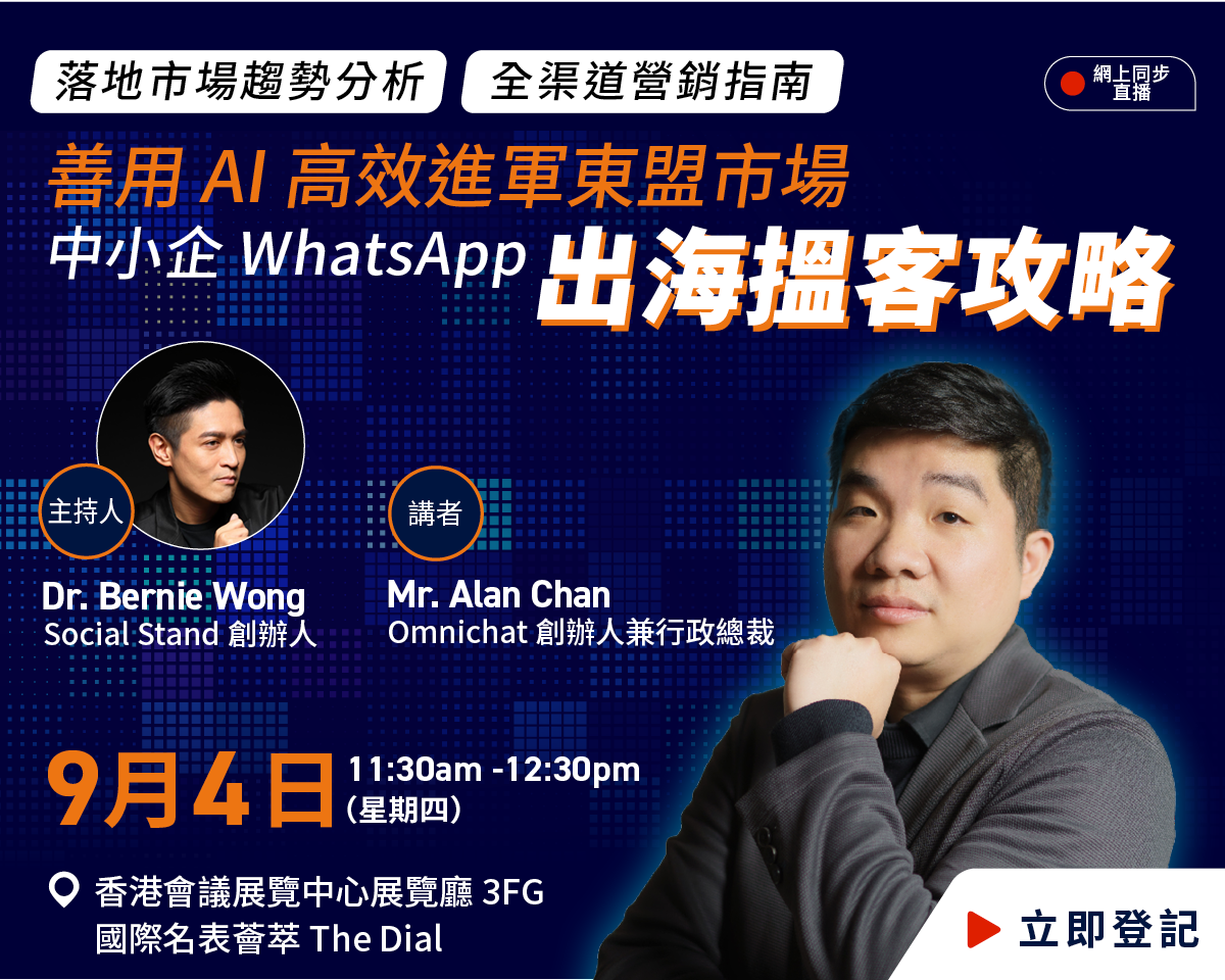 【現場座位有限,名額先到先得】想進軍充滿機遇的東盟市場,卻面臨種種挑戰?客戶溝通效率低下、推廣成本高企、銷售轉化不如預期、甚至不知道如何選擇合適的行銷平台?
