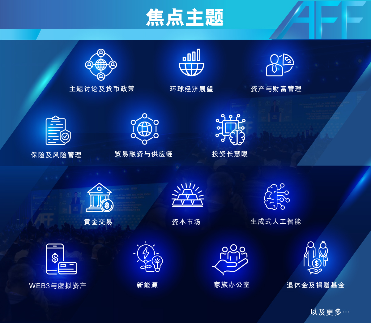 亚洲金融论坛2026以创新视野与精彩亮点,深入探讨全球经济、资产与财富管理、保险与风险管理、贸易融资与供应链等多个领域的前景与机遇。论坛汇聚卓越讲者,并提供环球投资项目对接机会,促进交流与合作。本年论坛亦全新推出「FutureGreen展示区」,聚焦绿色金融及可持续发展创新,引领绿色未来。