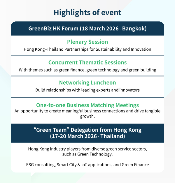 Cross-Border Collaboration: It promotes green technology and ESG-driven partnerships, enabling Thai and Hong Kong enterprises to co-develop sustainable solutions and meet rising demand for climate-resilient infrastructure and responsible investment across the GBA and ASEAN. |