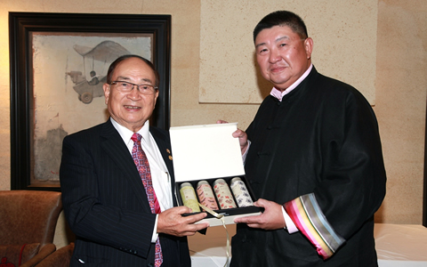 台灣商業總會常務理事戴良川(左)向「商合會」主席李大壯(右)送贈紀念品